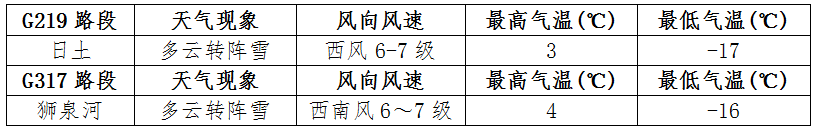 泽贡高等级公路沿线晴,最高气温为10.6℃,最低气温为-5.5℃,最大风速为7.9m/s。