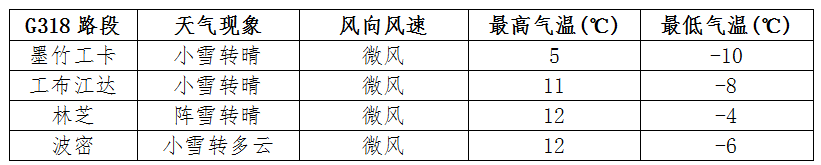 林拉高等级公路沿线林芝段阵雪转晴,工布江达至墨竹工卡段小雪转晴,达孜至拉萨段阴转晴,最高气温为12.0℃,最低气温为-4.0℃。