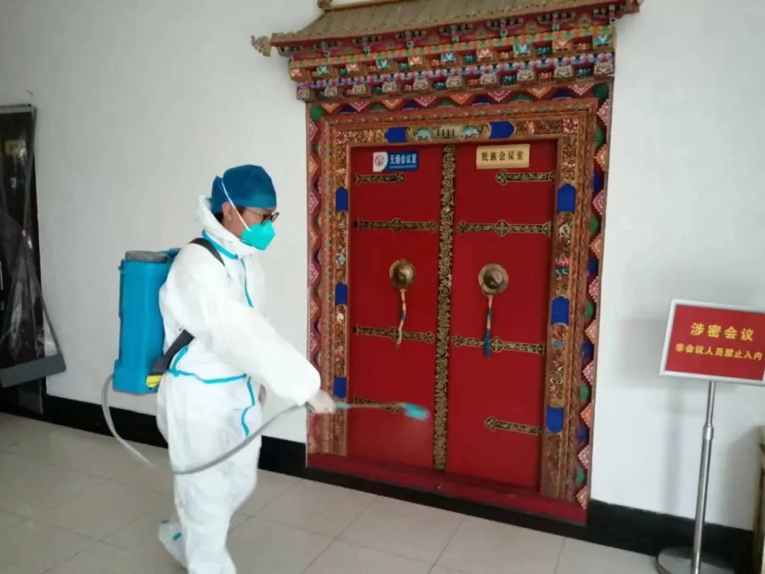 援藏干部周亮来到西藏后,血压一度居高不下,咽炎严重呼吸困难,但他还是克服了身体的不适,每日坚持承担着大院内重点场所的消毒消杀工作,工作时出汗导致眼镜起雾而视物模糊,消毒液挥发的腐蚀性气味让鼻腔过敏,每次工作完汗水都湿透了衣服,这些,都让他苦不堪言,但他都以超强的意志和信念坚持下来。