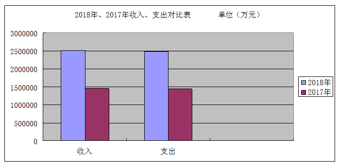 2018年度公共预算总收入2,505,985.16万元(不含上年结转数16,411.2万元),公共预算总支出2,482,020.04万元,结转下一年40,447.89万元。2018年一般公共预算总收入同比2017年1,454,550.35万元,增加1,051,434.80万元,增幅72.3%,主要原因是车辆购置税补助地方转移支付资金较上一年增加1,057,864.12万元。2018年一般公共预算总支出同比2017年1,446,065.19万元,增加1,035,954.85万元,增幅71.64%。,主要原因是车辆购置税补助地方转移支付资金大幅提升,年度投资完成固定资产投资数增加。