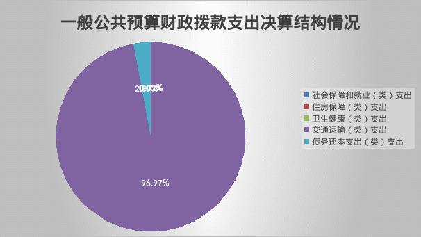 2024年度一般公共预算财政拨款支出1,685,800.62万元,主要用于以下方面:社会保障和就业(类)支出426.34万元,占总支出0.03%;住房保障(类)支出379.82万元,占总支出0.02%;卫生健康(类)支出190.85万元,占总支出0.01%;交通运输(类)支出1,634,803.61万元,占总支出97%;债务还本支出(类)支出50,000.00万元,占总支出2.97%。