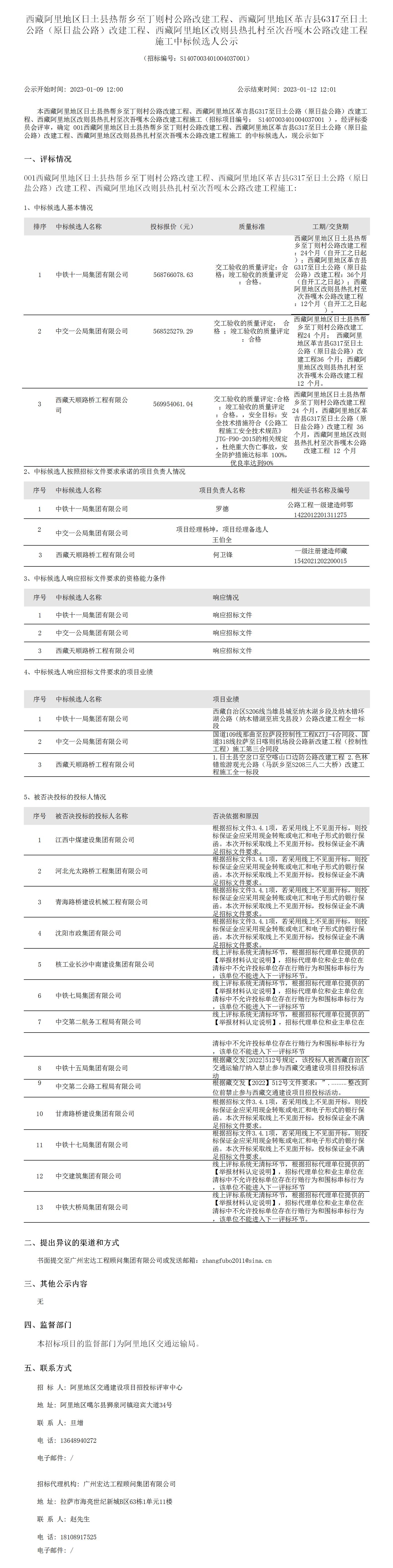 西藏阿里地区日土县热帮乡至丁则村公路改建工程、西藏阿里地区革吉县G317至日土公路(原日盐公路)改建工程、西藏阿里地区改则县热扎村至次吾嘎木公路改建工程施工中标候选人公示