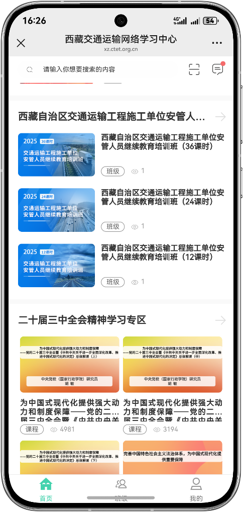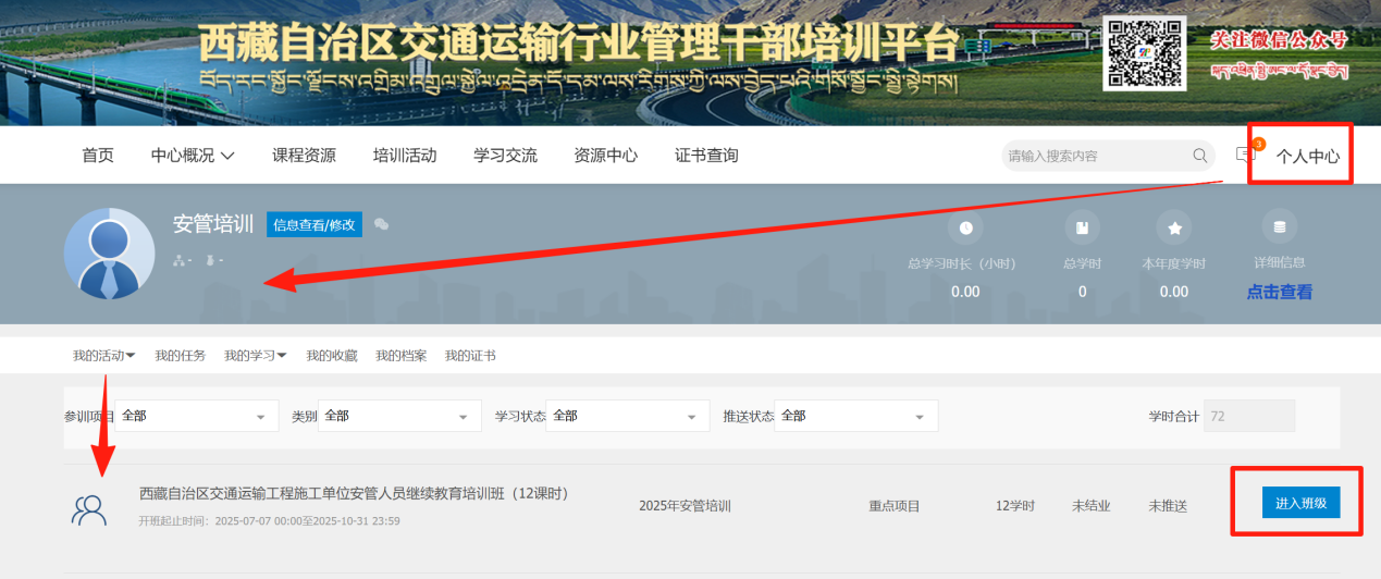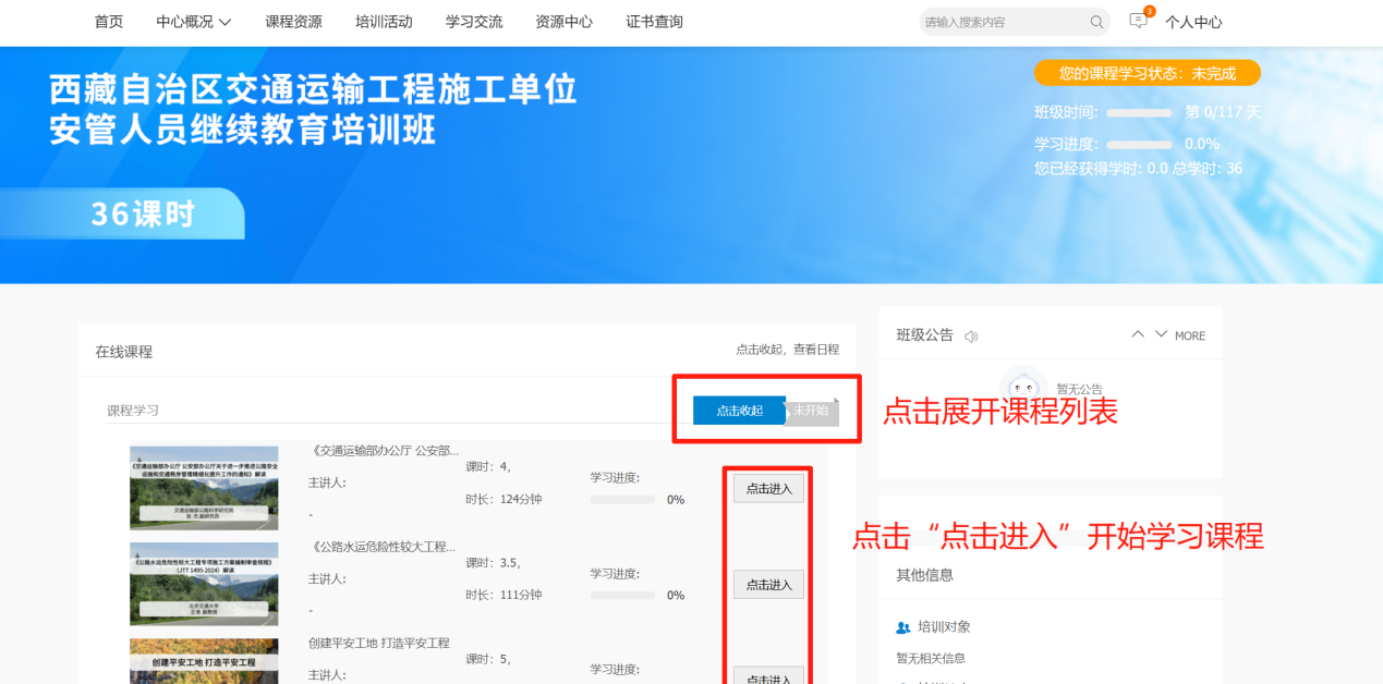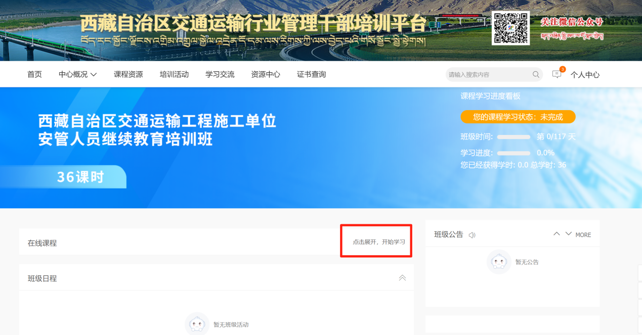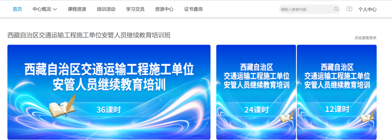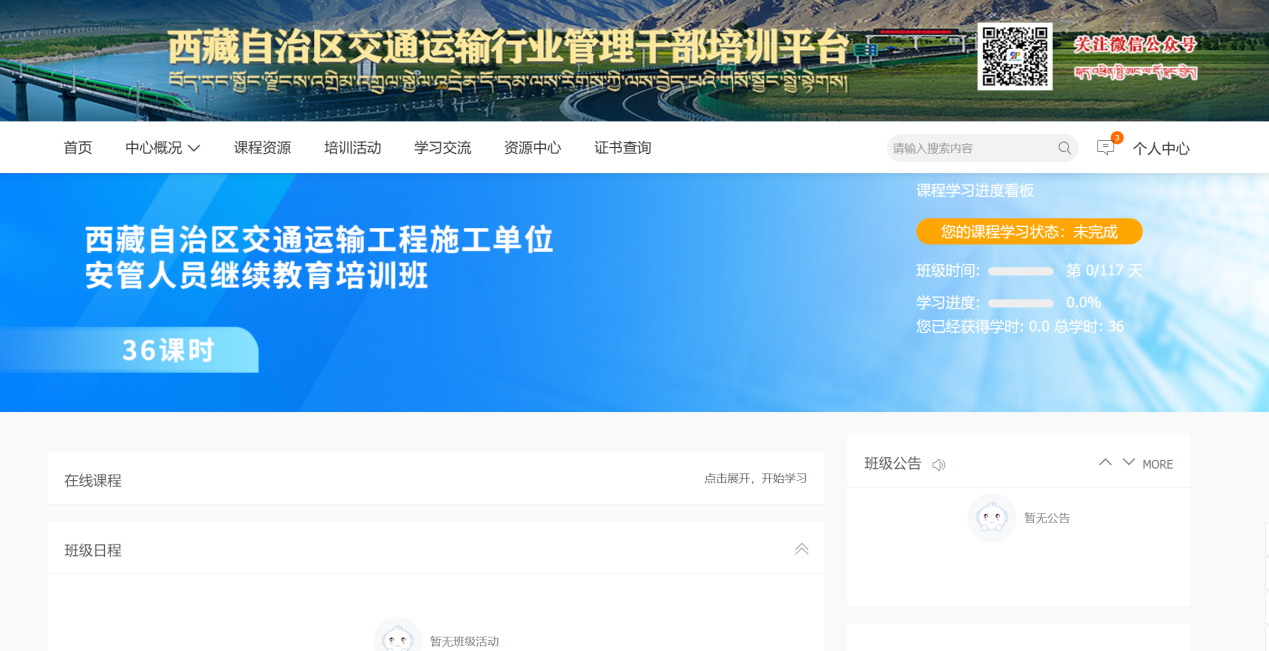 3.登录后,在首页西藏自治区交通运输工程施工单位安管人员继续教育版块选择相应的课时班级进入学习。