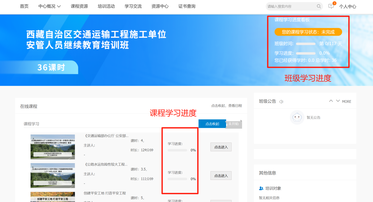 在课程学习页面,每一门在线课程后会显示当前课程的学习进度,在页面顶部会显示当前班级的学习进度数据。